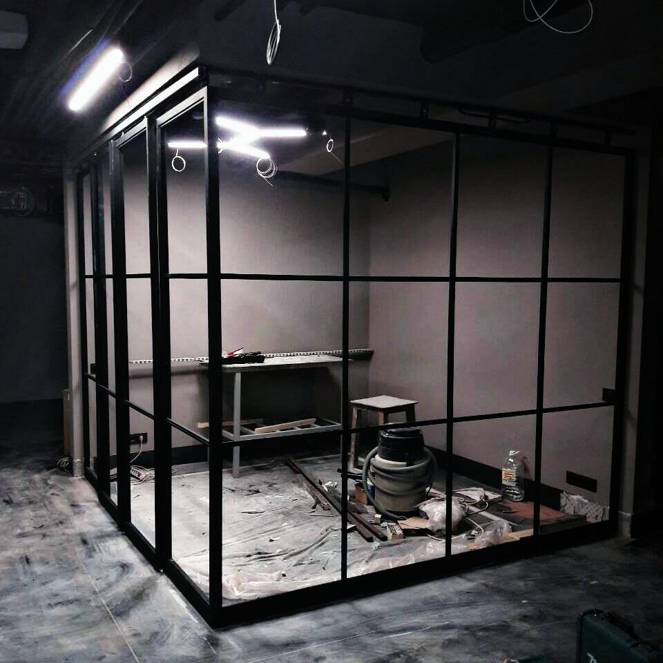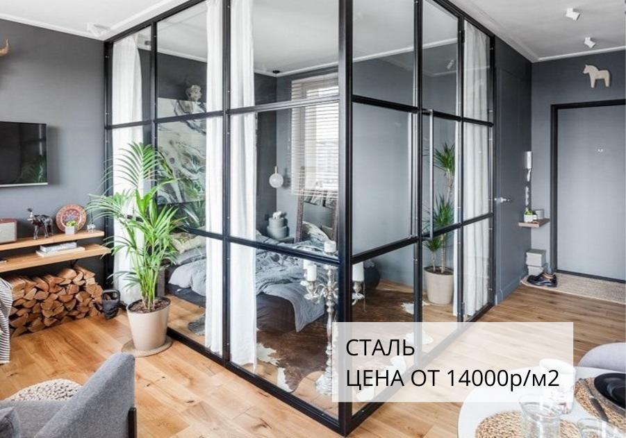 Распашные, раздвижные, статичные перегородки лофт, а также перегородки-книжка, перегородка гармошка могут быть изготовлены из стального профиля. Отличительной чертой является наличие штапика или рамки, которые держат стекло в ячейках. Перегородки из стали имеют более "брутальный" вид и являются оригинальным решением по зонированию пространства.