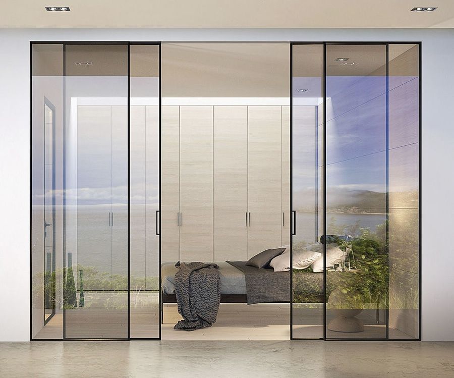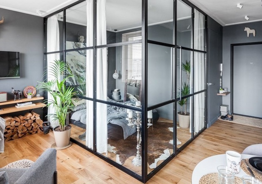 Стеклянная перегородка в комнату: любите, когда в помещении много света, просторно, – выбирайте прозрачные/просветлённые стёкла: они пропускают дневной/солнечный свет, зрительно расширяют пространство, позволяют равномерно распределить естественное и искусственное освещение; желаете иметь уединённый уголок в студии – используйте тонированное, матовое, цветное стеклянное наполнение; хочется в интерьере чего-то необычного, не нравится минимализм – подойдёт декорированное стекло (фацетированное, с пескоструйной обработкой, с росписью).